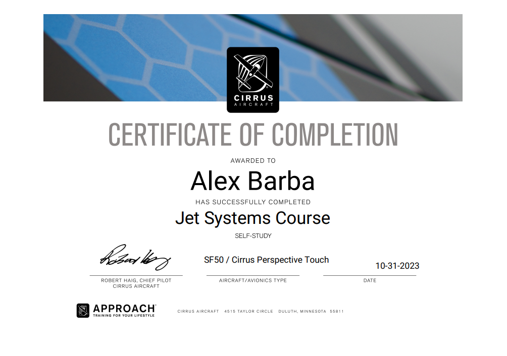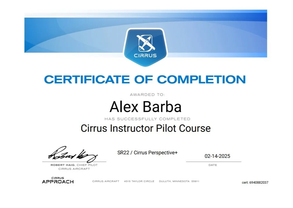 I began flying Cirrus Aircraft in 2023 for a Cirrus Training Center and quickly learned to fly all three Cirrus airframes: SR20, SR22T, and the SF50! These incredible aircraft allowed me to learn to fly throughout the United States to the most challenging airspaces and airports. In February 2025, I completed the Cirrus Standardized Instructor Pilot (CSIP) course at the Cirrus Vision Center in Knoxville, Tennessee.